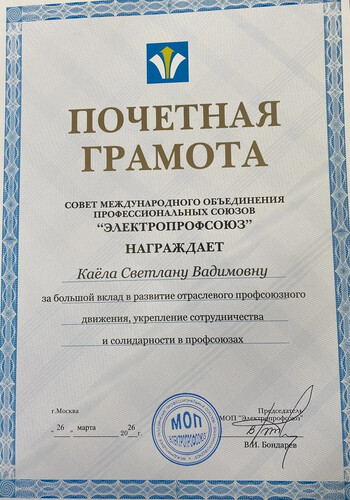 Торжественным событием стало награждение профсоюзных лидеров территориальных организаций и победителей профсоюзных конкурсов. Одну из наград от Международного объединения профессиональных союзов «Электропрофсоюз» вручили Светлане Каёла. Председатель Волгоградского Электропрофсоюза удостоена почетной грамоты за большой вклад в развитие отраслевого профсоюзного движения, укрепление сотрудничества и солидарности в профсоюзах. В эти же дни состоялся семинар-совещание «О применении нейросетей в профсоюзных организациях», который провела ведущий специалист по организационно-профсоюзной и информационной работе Рослеспрофсоюза Екатерина Кислова. Вторая часть была посвящена актуальным темам внутрипрофсоюзной деятельности. Источник: по материалам ВЭП | |